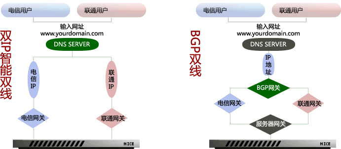 双IP智能双线需要设置两个IP地址,最佳访问路由是由域名DNS服务器根据访问者的登陆IP来确定的。 相比双IP智能解析,BGP双线服务器在骨干路由决定最佳路由时,有可能由于网间路由跳转次数比较多,访问的速度比双IP智能双线慢一点;而双IP智能双线由于是软件决定,有可能由于软件数据库不完整或者IP数据的变更造成的自动识别错误。 总之BGP双线与双IP智能双线各有千秋,各有优势,在解决中国南北电信问题上都充当着重要的角色。 |